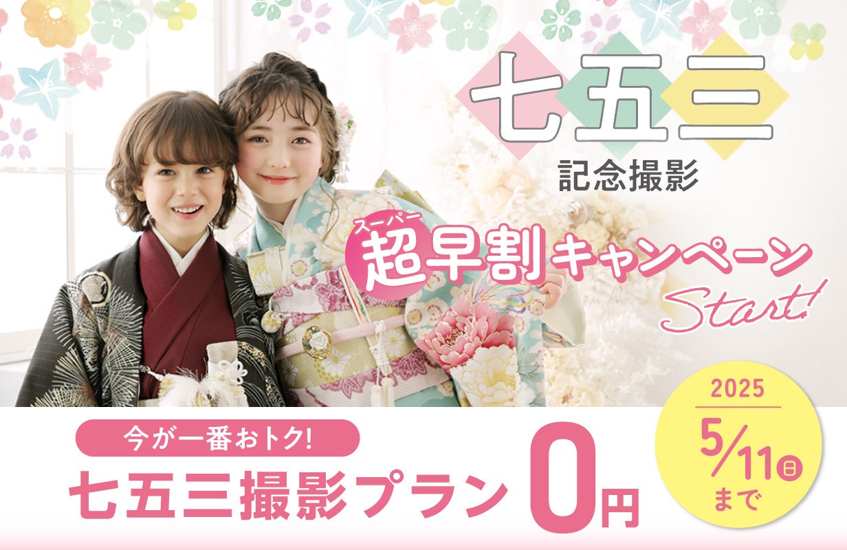 東海地方でフォトスタジオを20店舗運営する株式会社タートル(本社:愛知県春日井市、代表取締役社長:亀山直樹)は、2025年4月19日(土)〜2025年5月11日(日)で「七五三の超早割キャンペーン」を実施いたします。自社データによると、昨年度七五三でタートルをご利用されたご家族の「3組に1組」が夏前までに七五三プランの予約を済ませていたことがわかりました。「超早割キャンペーン」を利用すると、“0円”からタートルでの着付け・撮影プランを利用できます。お子様にもお財布にも優しい七五三の思い出を一緒に作りませんか?