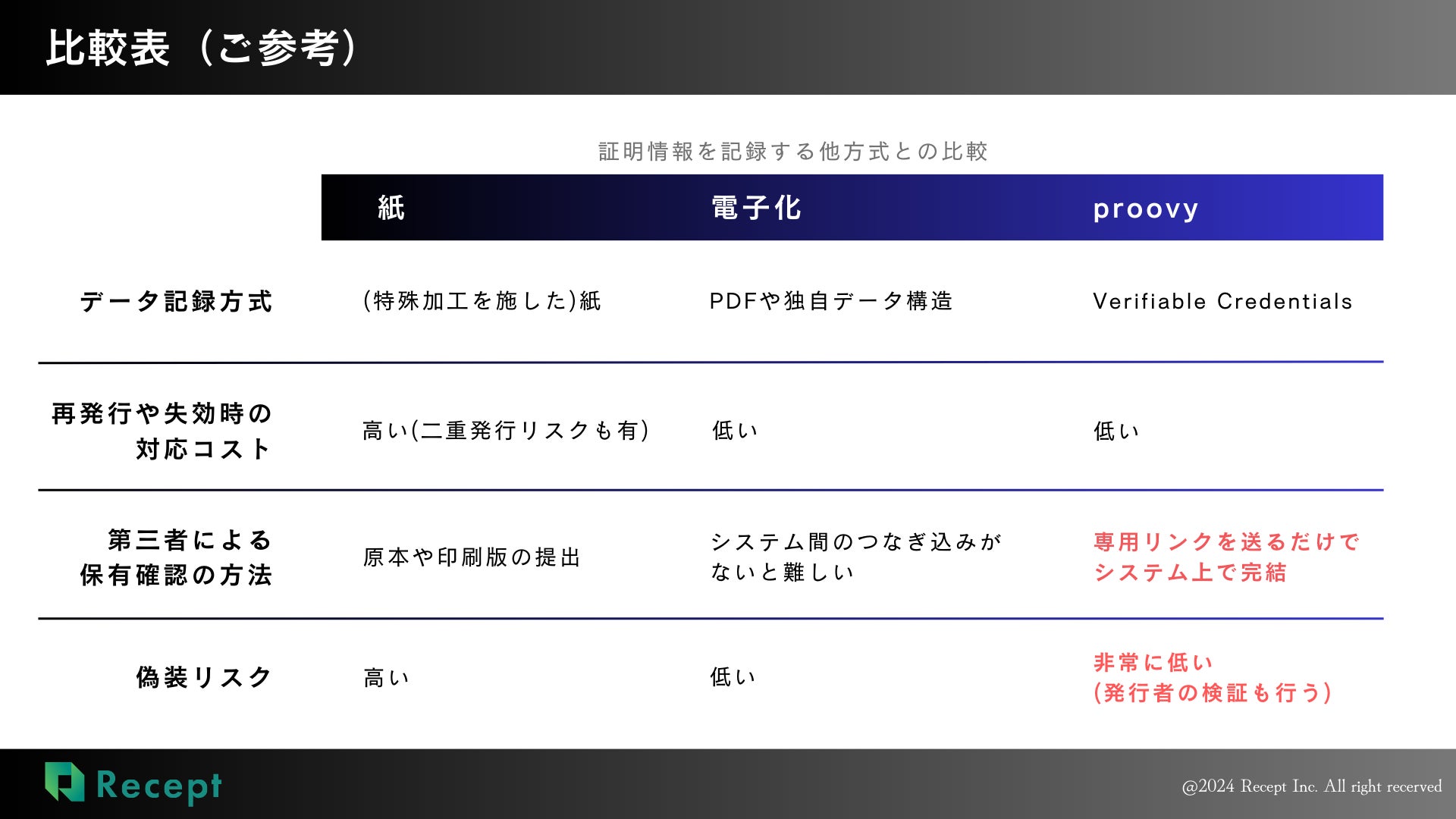 必要な情報が記録された証明証をそれぞれ提出する必要がなくなり、提出者・検証者ともに効率化が図れる