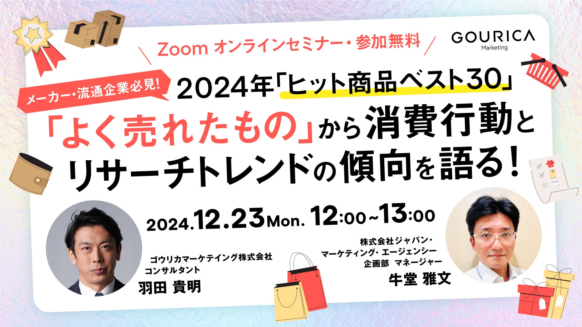 「人に寄りそう合理化」で企業変革をサポートするゴウリカマーケティング株式会社(本社:東京都渋谷区、代表取締役:岡本賢祐、以下ゴウリカマーケティング)は、12月23日(月)に、2024年 ヒット商品ベスト30「よく売れたもの」から消費行動とリサーチトレンドの傾向を語る!と題したウェビナーを実施いたします。