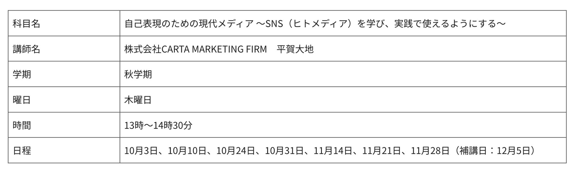 株式会社CARTA HOLDINGSのグループ会社で、マーケティング特化の事業を展開する株式会社CARTA MARKETING FIRM(東京都港区虎ノ門、代表取締役:西園 正志、以下CARTA MARKETING FIRM) プロダクト事業局 局次長 ・SNS統括の平賀 大地は、2024年10月から12月にかけて、早稲田大学 Life Redesign Collegeにて、専門科目群/Communication(コミュニケーション)領域/「自己表現のための現代メディア」と題し、SNS(ヒトメディア)に関する講義を全7回にわたり開催します。