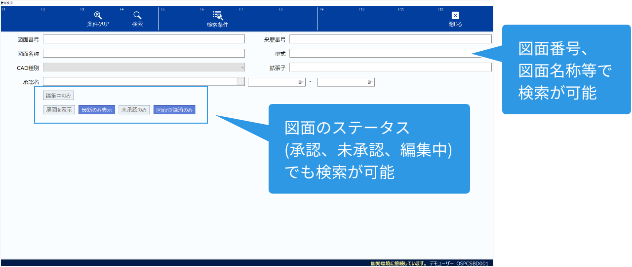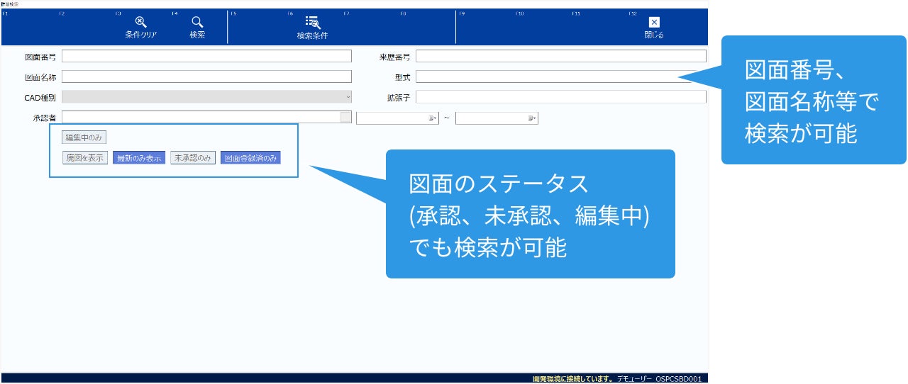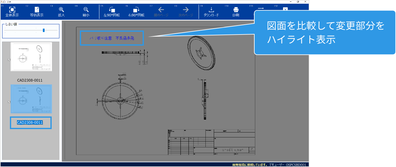 必要な図面を探すのに時間がかかっている…属性検索で目的の図面を素早く検索することができるので、検索のストレスから解放されます。プレビュー機能やレイヤプレビュー(図面比較)などサムネイル機能も充実しており、版管理機能で変更履歴を管理。最新の図面が一目でわかります。旧バージョンも簡単に確認できます。