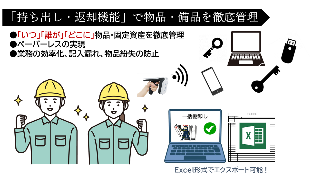 備品の貸出・返却を行う際は、物品に貼り付けたRFIDタグをハンディーリーダーで一括読み取りして、持ち出し・返却台帳を瞬時に作成することができ、「いつ」「誰が」「何を」持ち出したか?を、的確に管理可能です。情報の一元管理により、漏れや紛失を防止します。