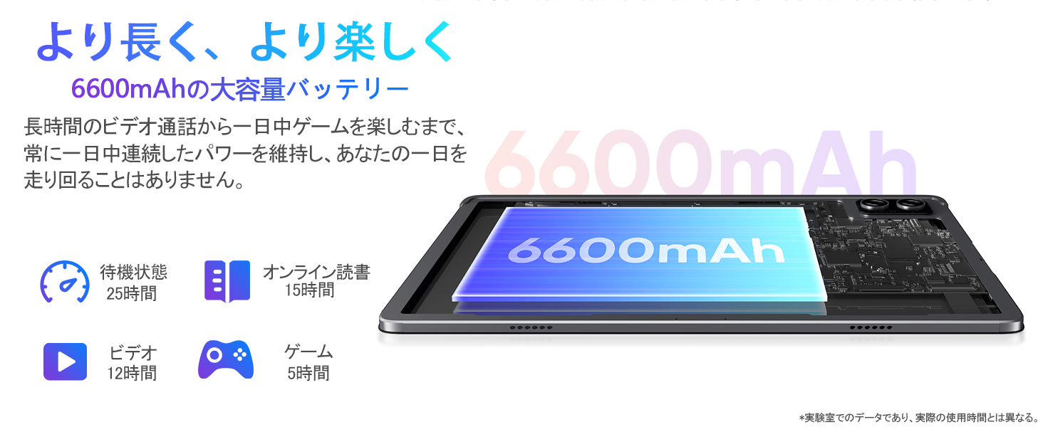 6600mAhバッテリー+ USB-C充電。スマートなRAM割り当て機能で処理速度が向上し、多くのファイルを保存できます。
