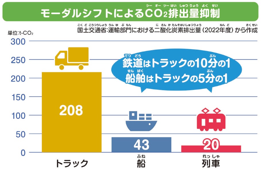 トラックによる長距離貨物輸送を、大量輸送が可能でCO2排出量が少ない列車や船などの輸送に切り替える「モーダルシフト」を積極的に推進しています。