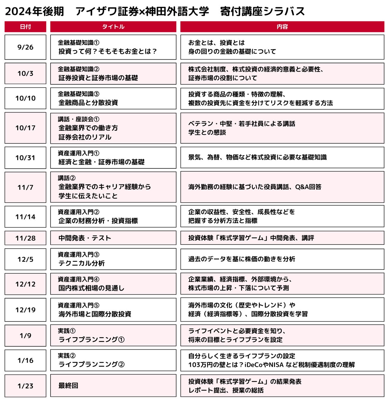 アイザワ証券株式会社(本社所在地:東京都港区、代表取締役社長:藍澤 卓弥、以下「当社」)は2024年9月より学生の金融リテラシー向上に向けた取組みの一環として神田外語大学(本校所在地:千葉県千葉市、学長:宮内 孝久)にて寄付講座を実施しております。