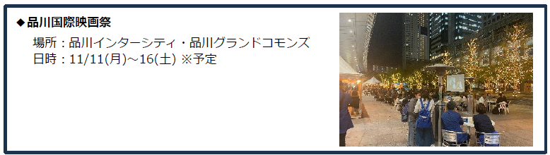 品川インターシティで11月11日〜16日に開催予定の「品川国際映画祭」では、緑豊かなセントラルガーデンのイルミネーションとともにさまざまなジャンルのショートフィルムが鑑賞できます。また、著名人がゲストとして参加する「トークショー」や「音楽LIVE」等、映画以外のコンテンツもお楽しみいただけます。