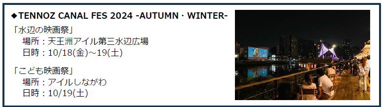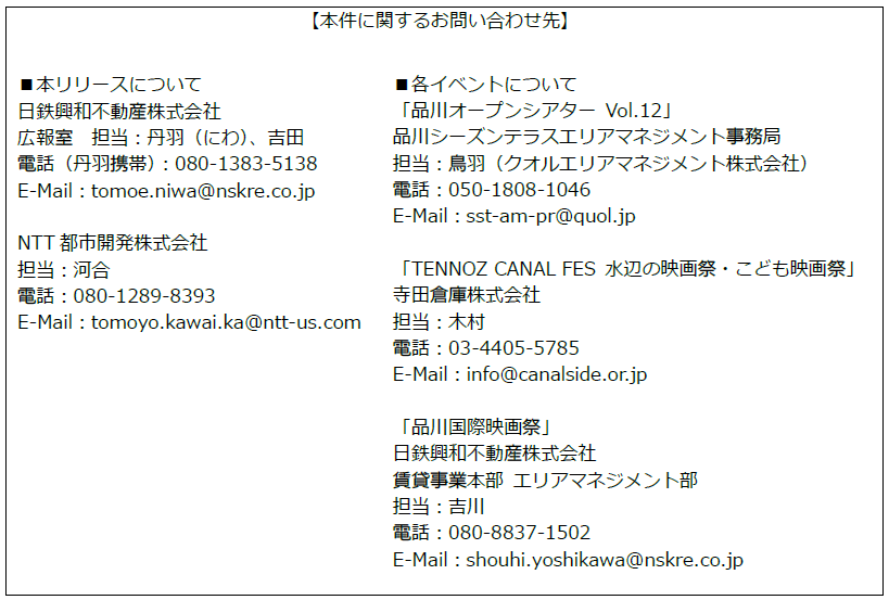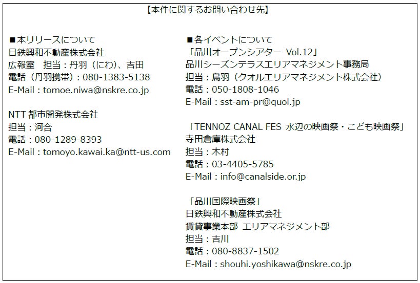 NTT都市開発株式会社(本社:東京都千代田区、代表取締役社長:池田 康)、⽇鉄興和不動産株式会社(本社:東京都港区、代表取締役社長:三輪 正浩)、一般社団法人天王洲・キャナルサイド活性化協会(東京都品川区、代表理事:三宅 康之)は、これまで品川地域の各会場でそれぞれ実施していた3つの屋外映画祭「品川オープンシアター」、「TENNOZ CANAL FES 水辺の映画祭・こども映画祭」、「品川国際映画祭」について、今秋初めて3会場連携した共同企画「緑と水辺のシネまちラリー~映画でつながる品川~」として開催いたします。