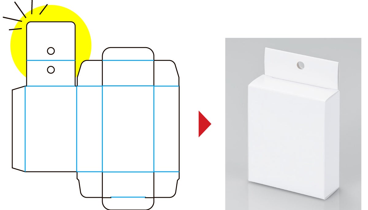 従来のツールでは、フック付き形状のテンプレートを作成することができず、当社に依頼していただく必要がありましたが、今回のアップデートで、キャラメル箱・地獄底・ワンタッチ底の3種のパッケージにおいて、フックの付いた形状も自動で箱展開図の作成が可能になりました。