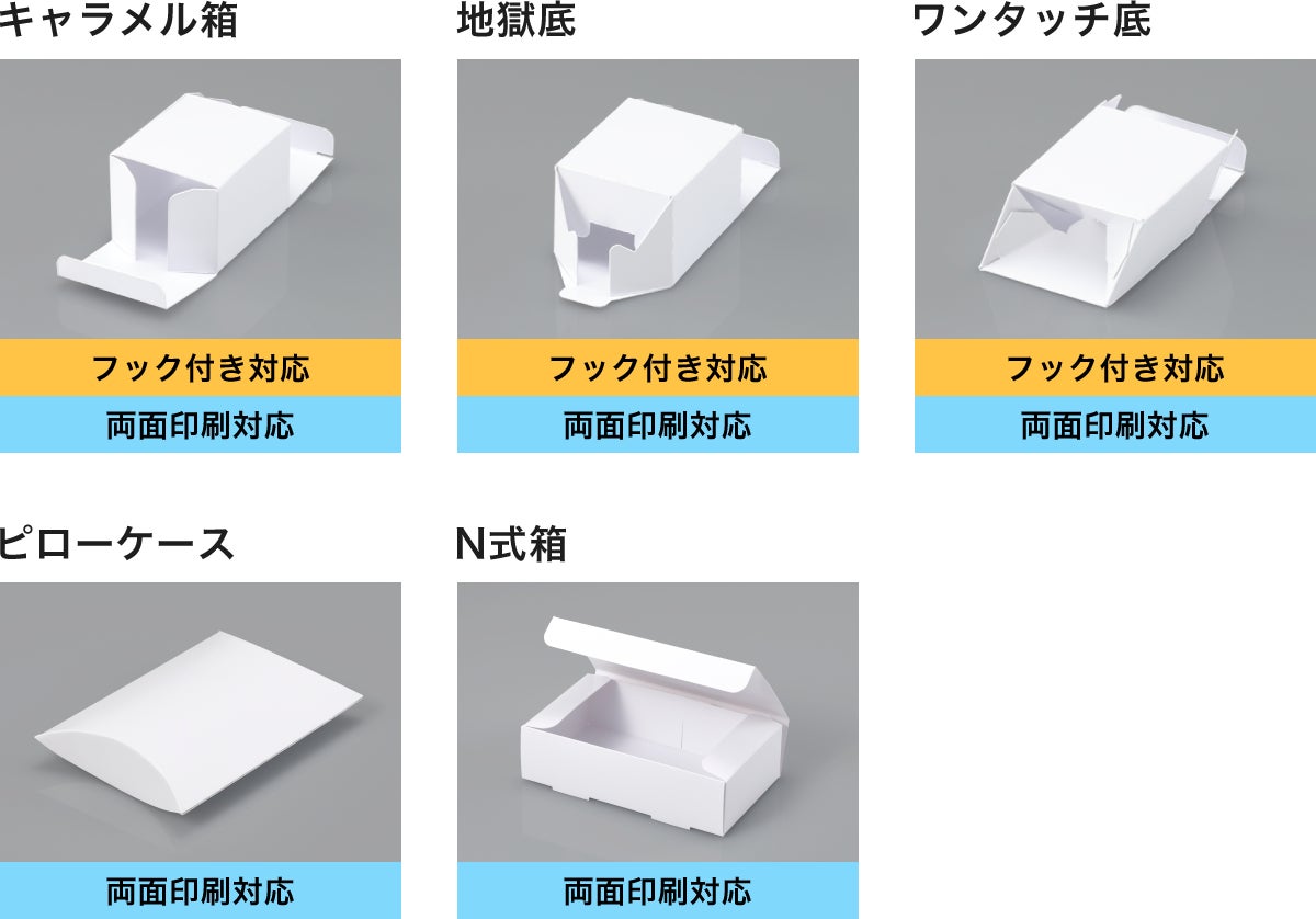 定番のキャラメル箱の展開図をはじめ、下記の形状の展開図をお好きなサイズで作成いただけます。