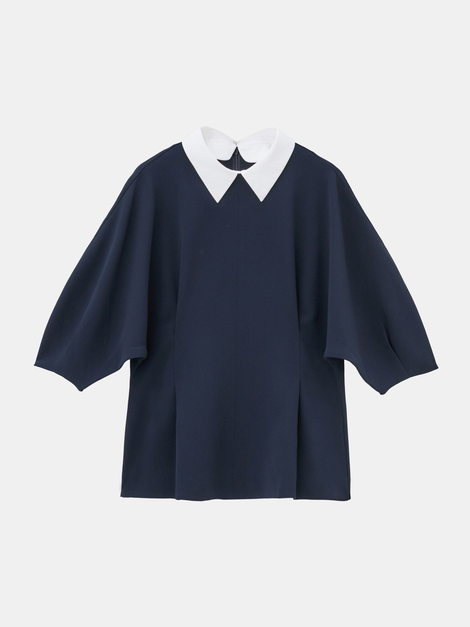 クリーンな印象のシャツカラーが目を引くブラウスは、丸みのある袖やウエストの下に入ったタックが立体的で、コーディネートの主役になります。襟を取り外してクルーネックのブラウスとして着用することもできるため、1枚でも雰囲気を変えて楽しむことができます。二の腕や腰まわりのラインが目立ちにくく、体型カバーができる点もうれしいポイントです。