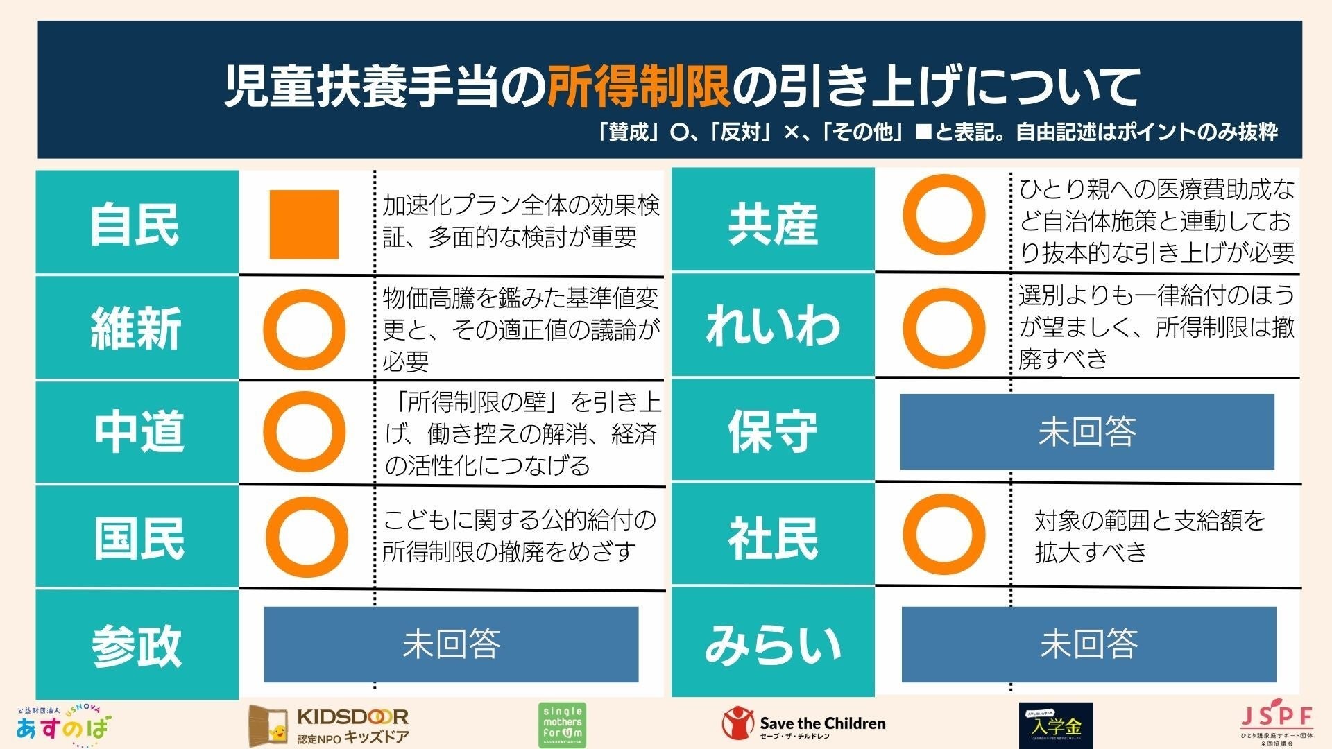 【児童扶養手当の所得制限の引き上げ】等に関する、各党の姿勢(賛成・反対・その他)