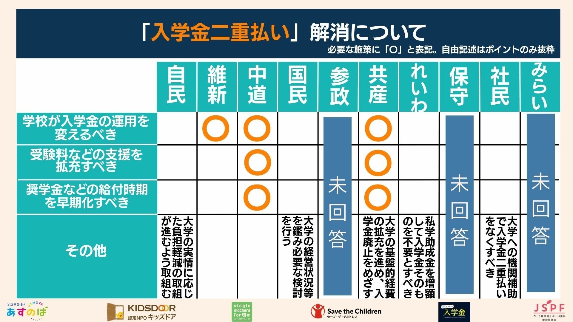 実施団体:公益財団法人あすのば、認定特定非営利活動法人キッズドア、特定非営利活動法人しんぐるまざあず・ふぉーらむ、公益社団法人セーブ・ザ・チルドレン・ジャパン、入学金調査プロジェクト、特定非営利活動法人ひとり親サポート団体全国協議会(50音順)