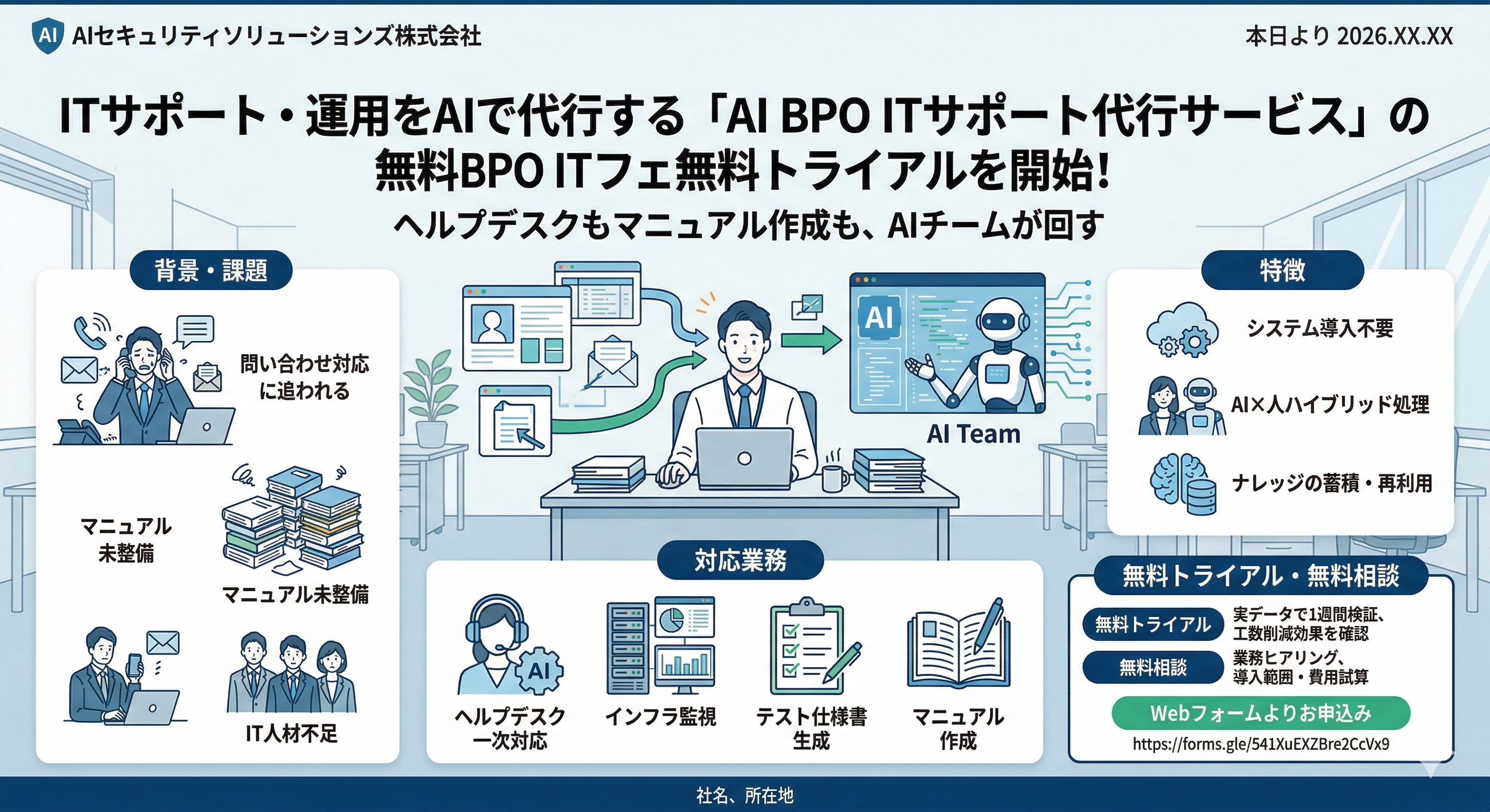 AIセキュリティソリューションズ株式会社(本社:東京都、以下当社)は、社内ITサポート・運用業務を代行する「AI BPO ITサポート代行サービス」について、本日より無料トライアルおよび無料相談の提供を開始しました。