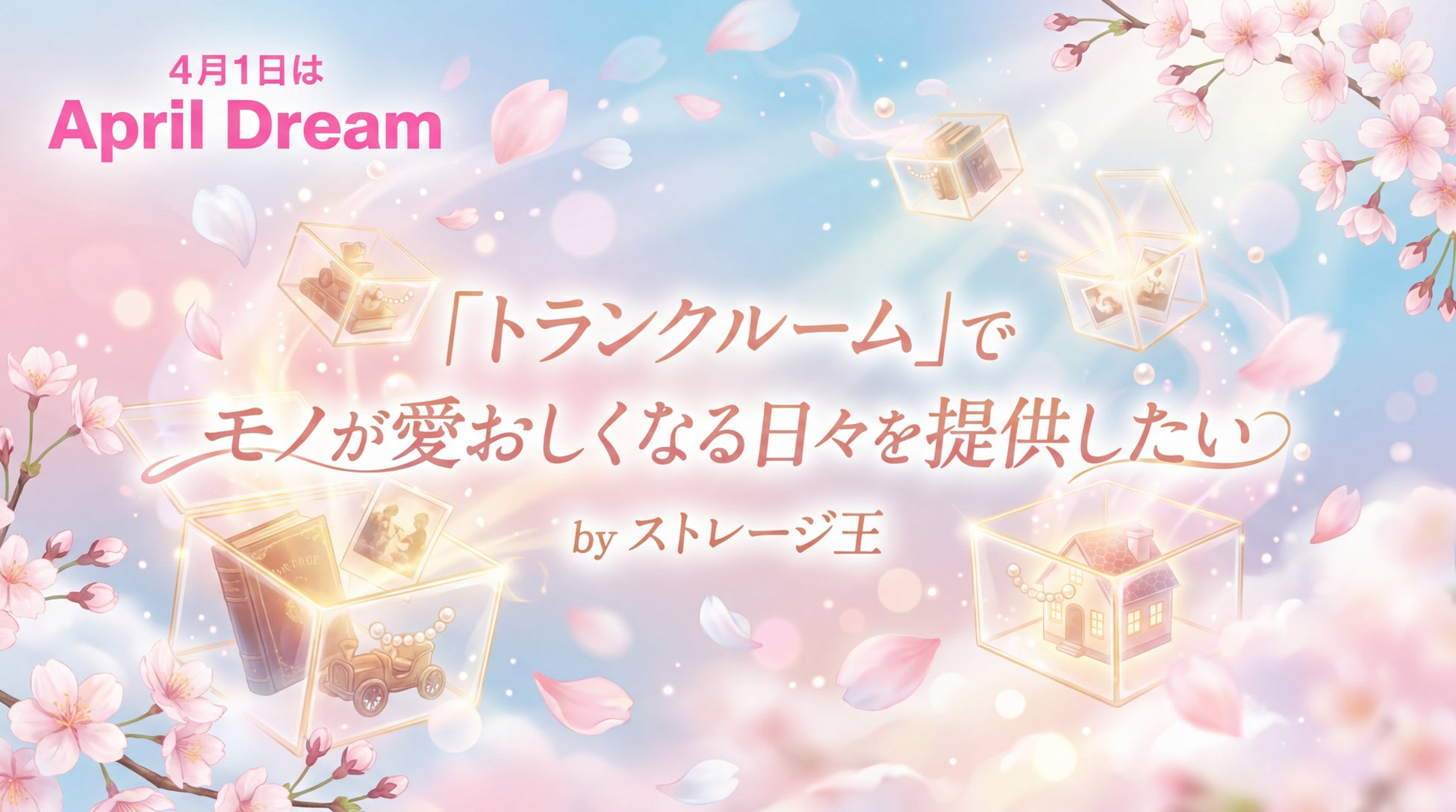 株式会社ストレージ王は、4月1日を夢を発信する日にしようとするApril Dreamに賛同しています。 このプレスリリースはトランクルームに関する企画、開発、運営、管理業を行う株式会社ストレージ王 (本社:千葉県市川市、代表取締役:荒川 滋郎、証券コード:2997、以下「ストレージ王」)の夢です。