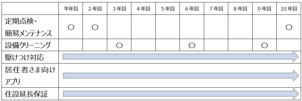 本サービスは、住宅のアフターサービスに必要なメニューをパッケージで提供するもので、定期訪問サービスとして、住宅引き渡し後10年間で、浴室や床下、外壁や屋根等の定期点検や、エアコン等の設備クリーニング※1を実施します。また、住まいに関するお困りごとへの駆けつけサービスや住宅関連データの閲覧を可能にする居住者さま向けアプリの提供、追加オプションとして、住宅設備の延長保証も可能です。アフターサービスは、Daigasグループで新築住宅事業等を手掛ける大阪ガス住宅設備株式会社の研修を受けた大阪ガスサービスチェーン※2担当者が行います。9月以降に、入居者さまに対してサービスを提供開始予定です。