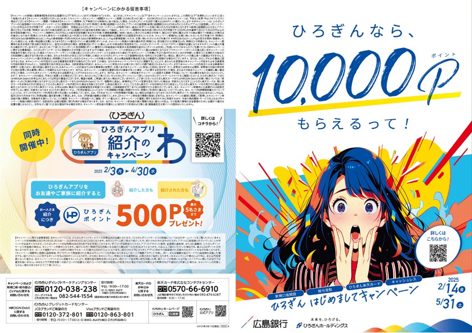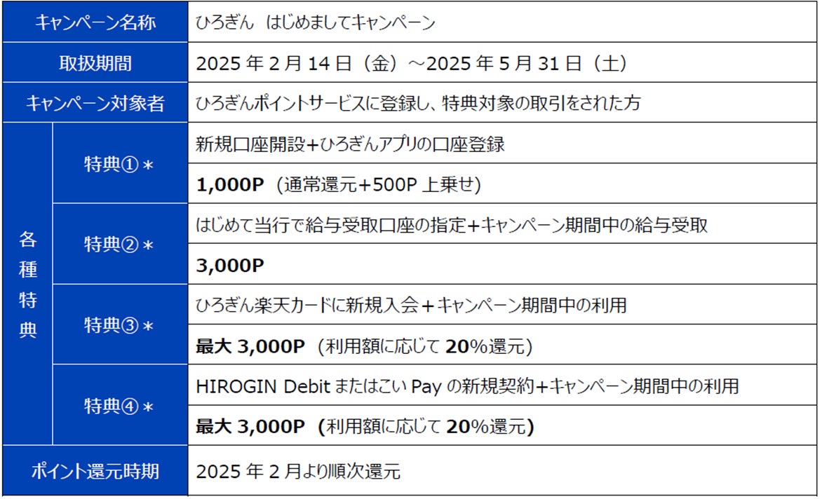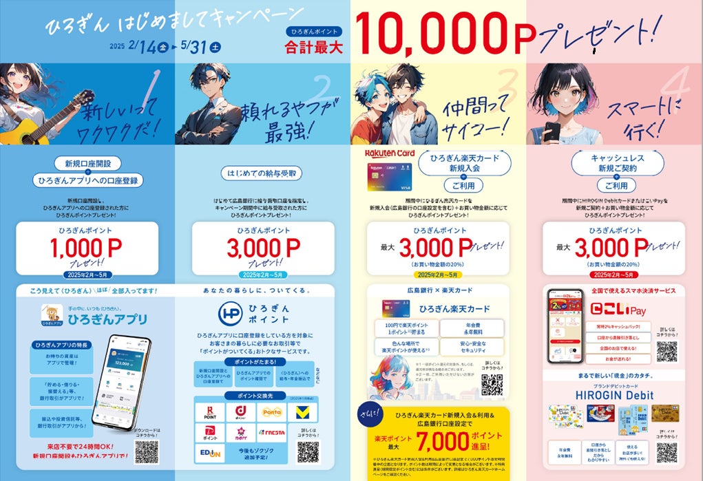 株式会社広島銀行(頭取 清宗 一男)では、当行との各種取引を開始いただいたお客さまへ、ひろぎんポイントを最大10,000P還元する「ひろぎん はじめましてキャンペーン」を実施しますので、下記のとおりお知らせいたします。