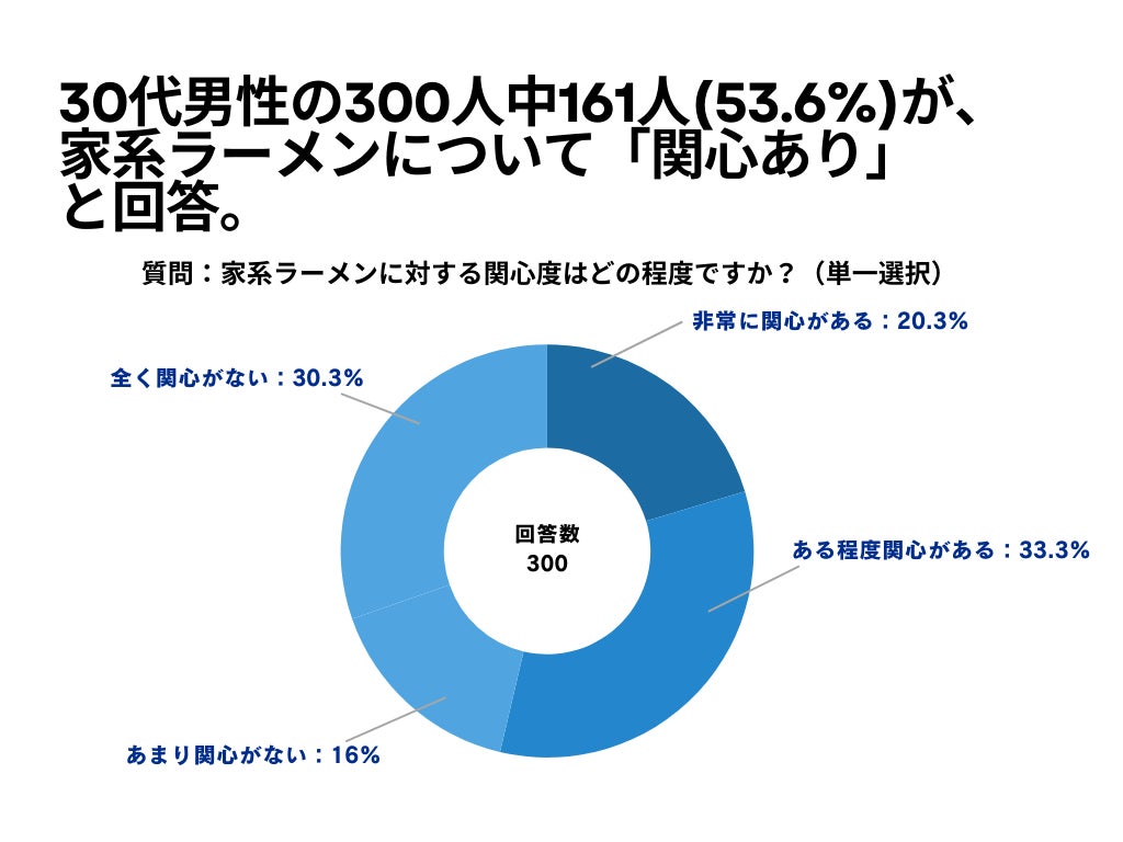30代男性の300人中161人(53.6%)が、 家系ラーメンについて「関心あり」 と回答【家系ラーメンに関するアンケート】