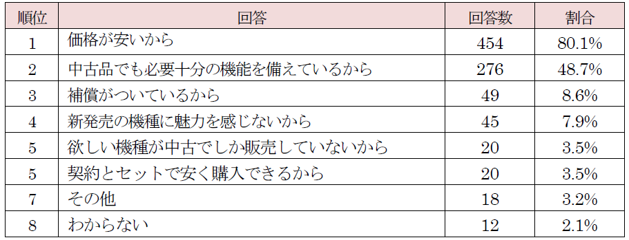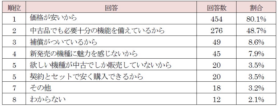 また、中古スマホの購入を検討する理由では、「価格が安いから」が80%以上の回答を集め1位、「中古でも必要十分の機能を備えているから」が48.7%で2位となりました。新品スマホ端末の高機能化と高価格化に対し、割安で必要十分の機能を備えている中古スマホが、価格・コスパを重視する人からの支持を集めていることが明らかになりました。