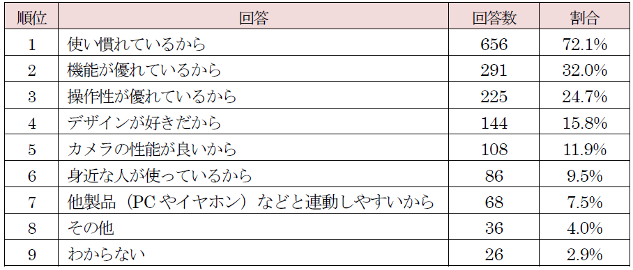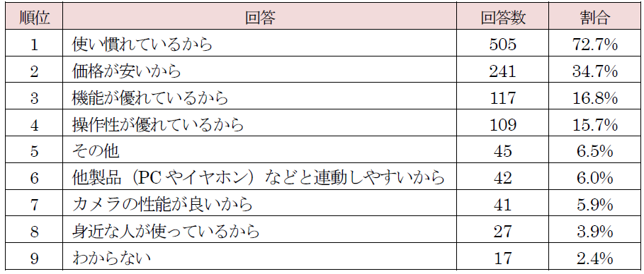 スマホ端末の購入理由では「使い慣れているから」が70%以上で最多