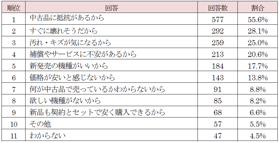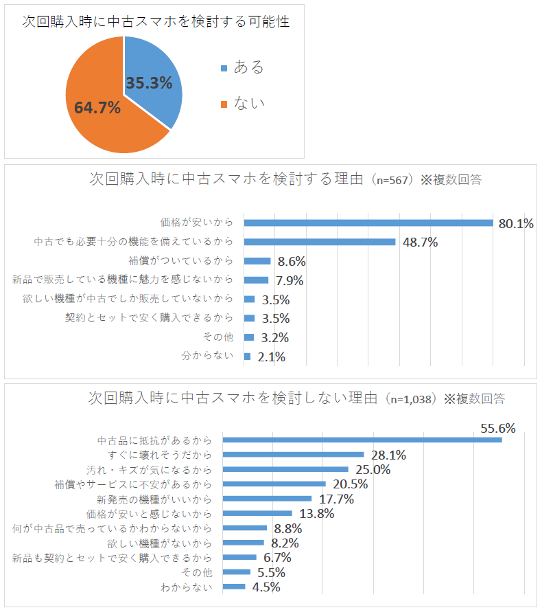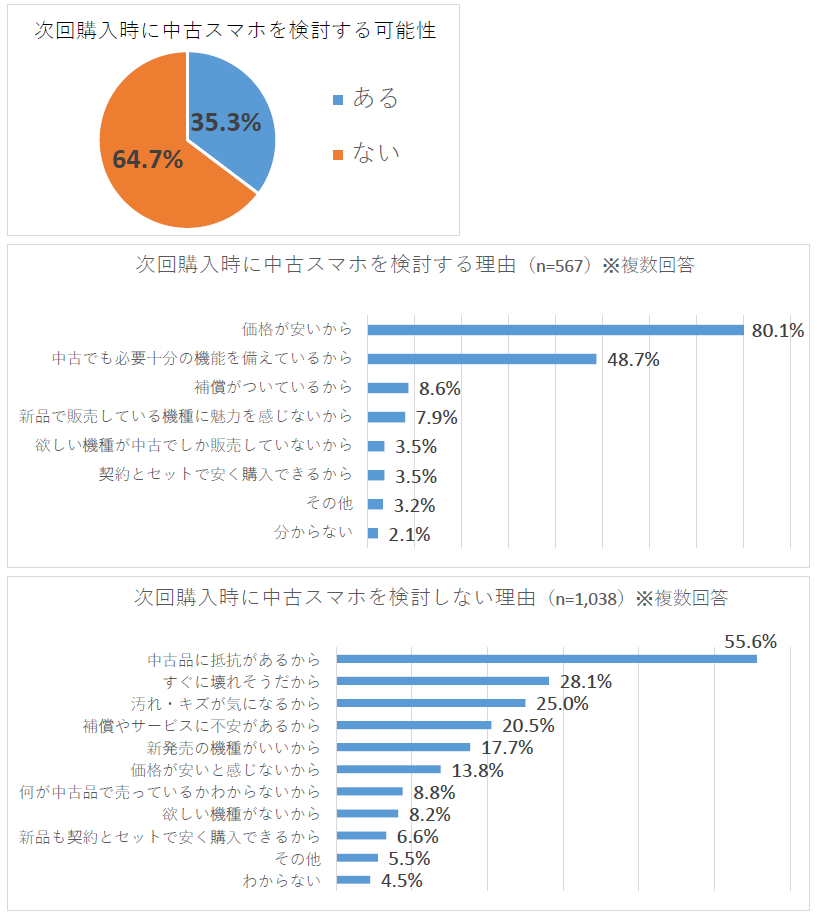 一方、64.7%の人は中古スマホの購入を検討する可能性がないと回答しています。その理由としては、「中古品に抵抗があるから」「すぐに壊れそうだから」「汚れ・キズが気になるから」などの回答が上位となりました。