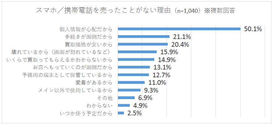 スマホや携帯電話を売ったり下取りに出したことがない理由では、「個人情報が心配だから」が50.1%を占めています。次いで「手続きが面倒だから」21.1%、「買取価格が安いから」20.4%、「壊れているから」15.9%が上位となりました。