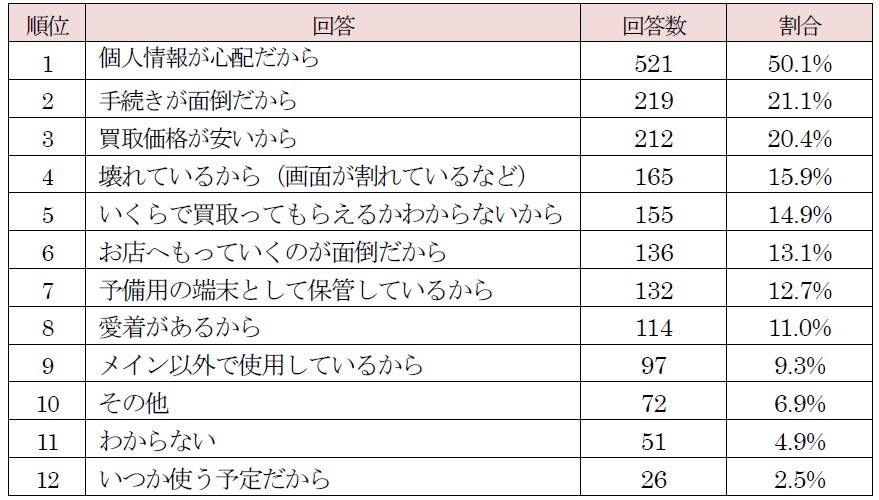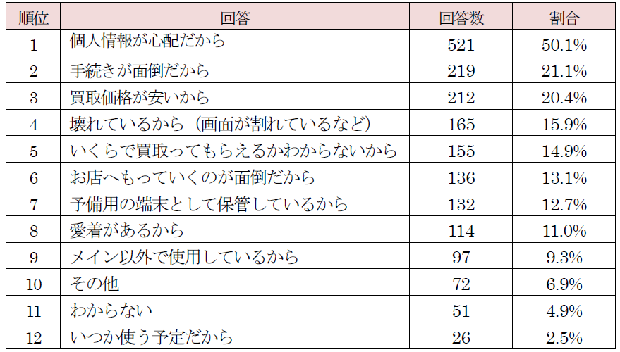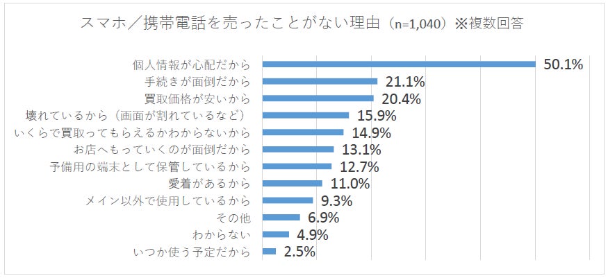 ・スマホや携帯電話を売らない理由は「個人情報が心配だから」(50.1%)※複数回答