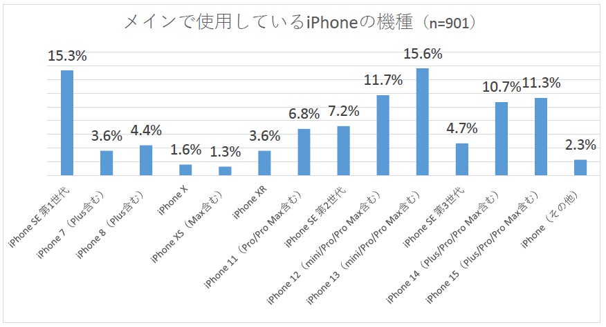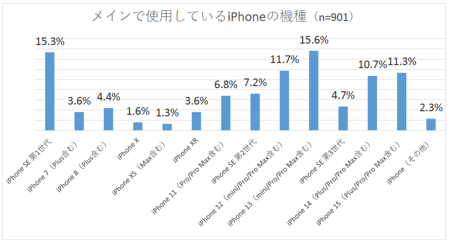 iPhoneをメインで使用していると回答した901人に使用している機種を質問したところ、「iPhone 13」シリーズが15.6%で最も多くなりました。2番目に多いのは「iPhone SE(第1世代)」15.3%、次いで「iPhone 12」シリーズ11.7%、「iPhone 15」シリーズ11.3%となっています。