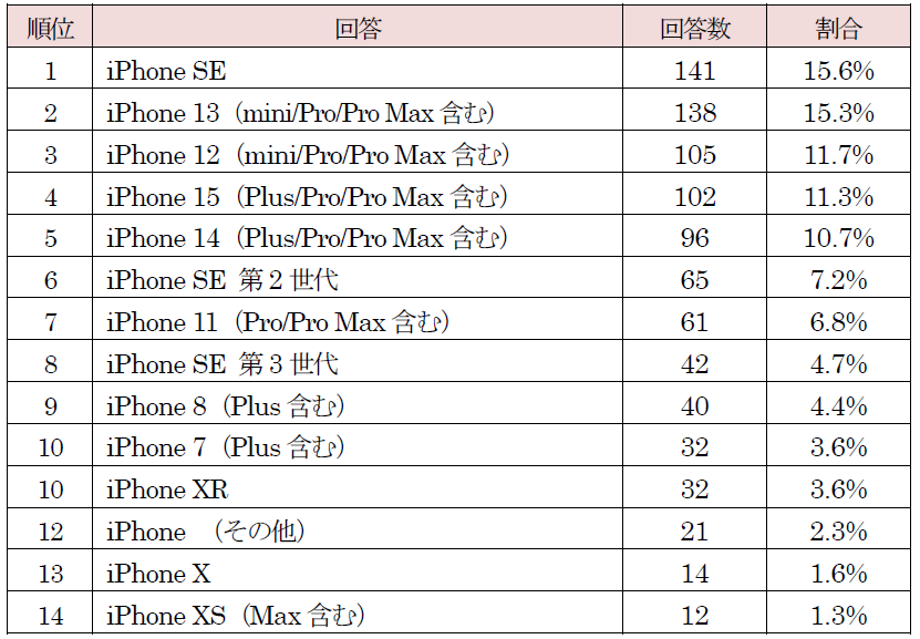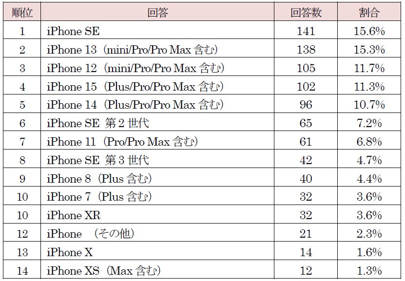 「iPhone SE(第1世代)」は2016年発売で、2022年 9月にリリースされた「iOS 16」以降はサポート対象外となっていますが、昨年の調査で1位、今回の調査でも2位となっています。「iPhone SE」シリーズはホームボタン搭載でTouch ID(指紋認証)が使える点や他のシリーズと比較して端末が軽くコンパクトなサイズなどの特長から、根強い人気を集めていると考えられます。