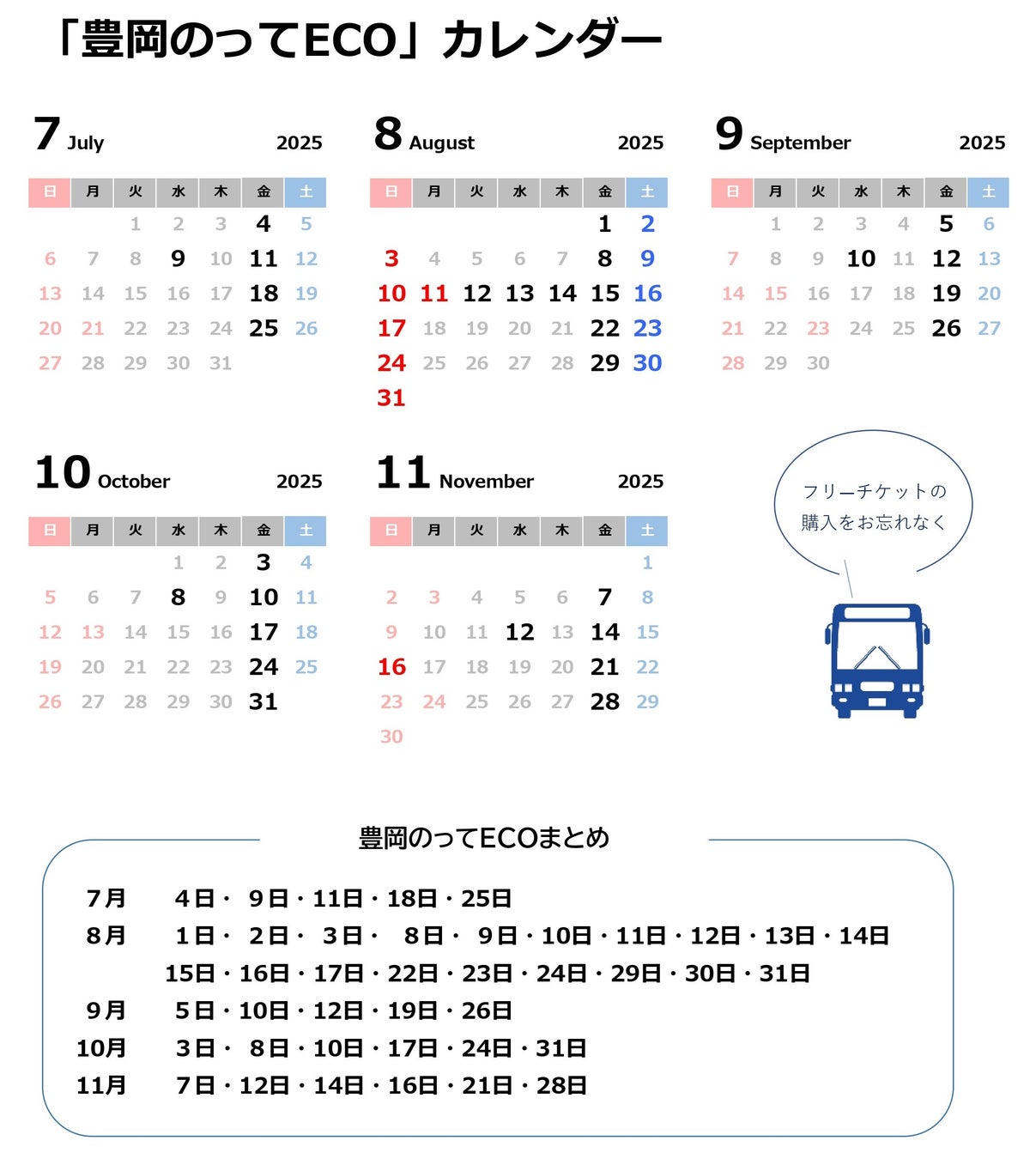 「豊岡のってECO」実施日に市内の路線バスやコミュニティバスなどが乗り放題となるフリーチケットを販売します。
