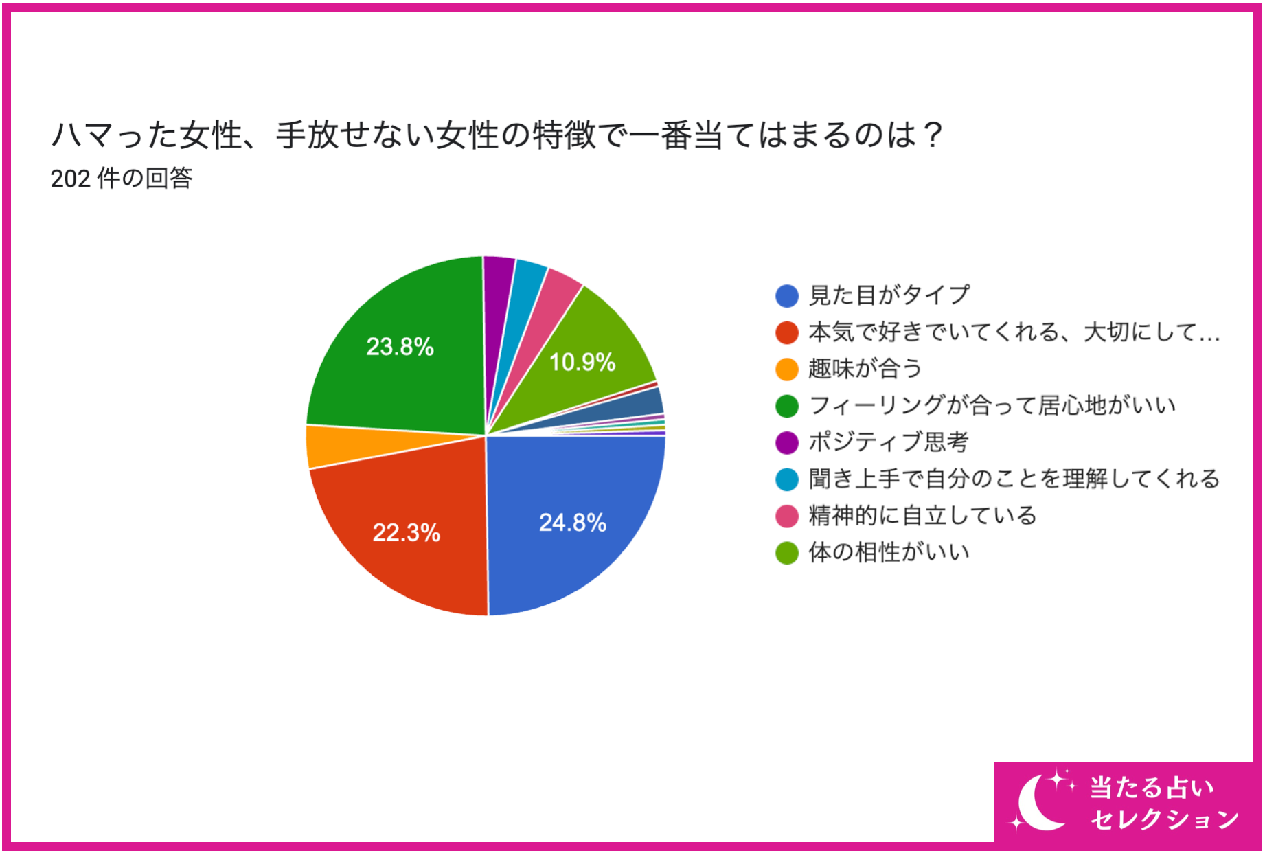 画像を見て分かる通り、男性の約24%(50/202名)が『見た目がタイプ』の女性にハマった、手放せないという結果となりました。アンケート結果からも分かる通り、男性は『見た目がタイプ』がの女性にハマる傾向がありました。初対面から一緒にいる時までずっと見た目は見ることも多く、友人等への紹介などをするときにも自慢できる点などが挙げられるでしょう。