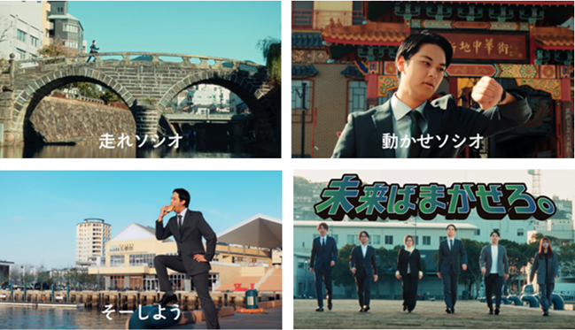 オリジナルソング「走れ!ソシオ」が流れる中、長崎スタジアムシティや中華街、眼鏡橋、当社佐世保オフィスなど各スポットに“街の未来を守るヒーロー”が出没。最後は「未来はまかせろ。」のコピーと共に6人のヒーローが佐世保港を歩くシーンで締めくくられます。