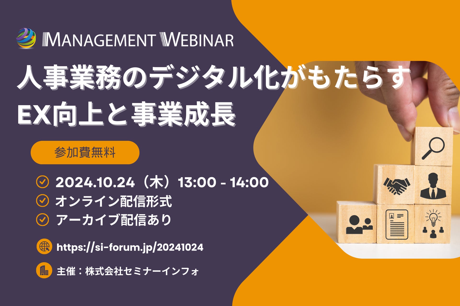 株式会社セミナーインフォ(本社:東京都千代田区 代表:小西 亘)は、2024年10月24日(木)にMANAGEMENT WEBINAR「人事業務のデジタル化がもたらすEX向上と事業成長」を開催いたします。