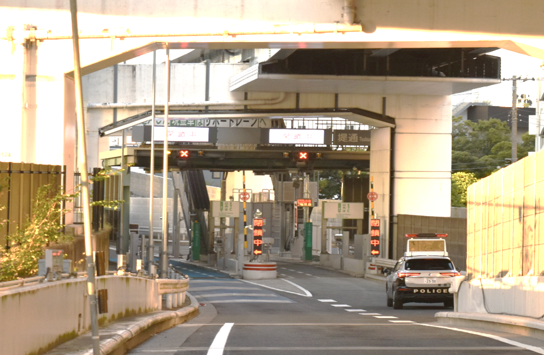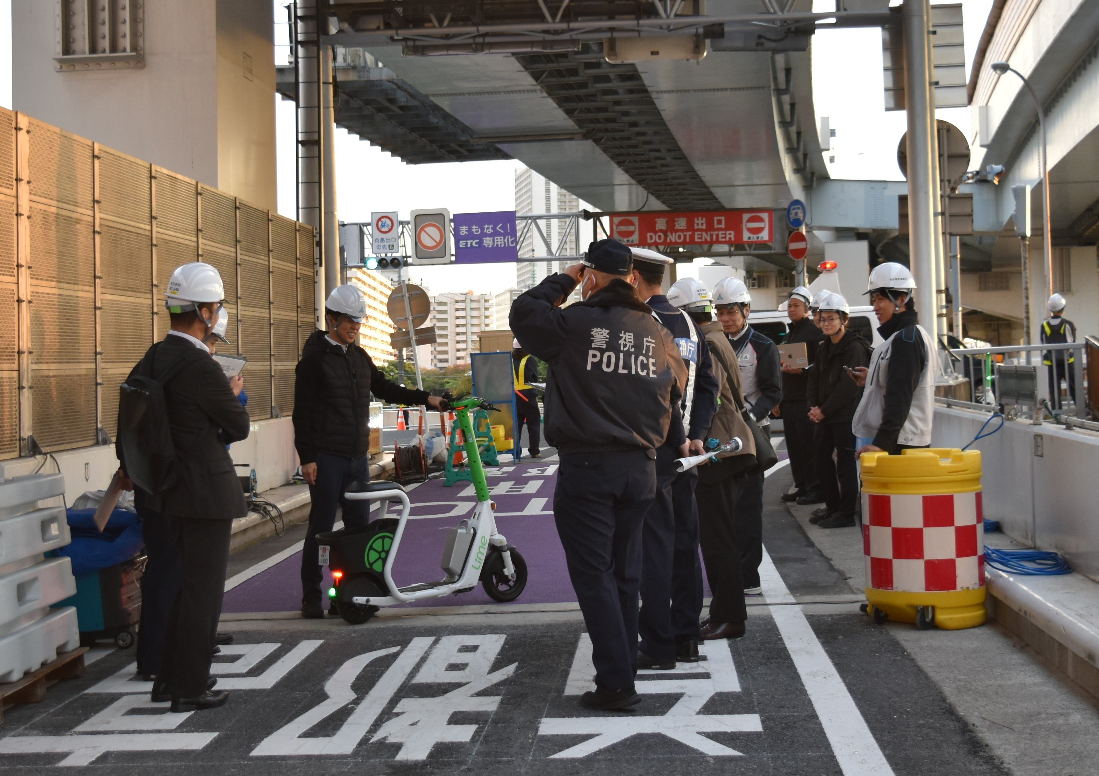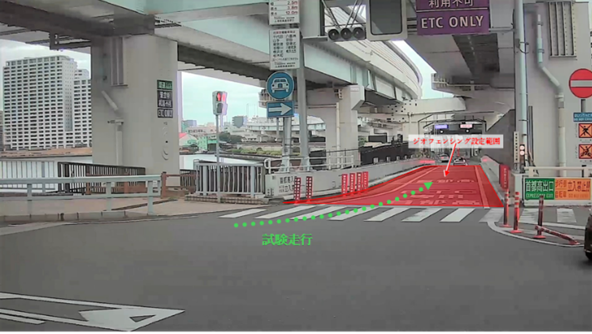 道路周辺環境が輻輳(ふくそう ※3)した都市部でのジオフェンシング制御技術の有効性を確認するため、警視庁及び首都高速道路株式会社の協力のもと、実際の道路形状やGPS信号環境における誤進入防止制御の挙動を現場で確認する実証実験を行いました。なお、実証実験にあたっては、料金所リニューアル工事による入口通行止めの機会を活用し実施しました。