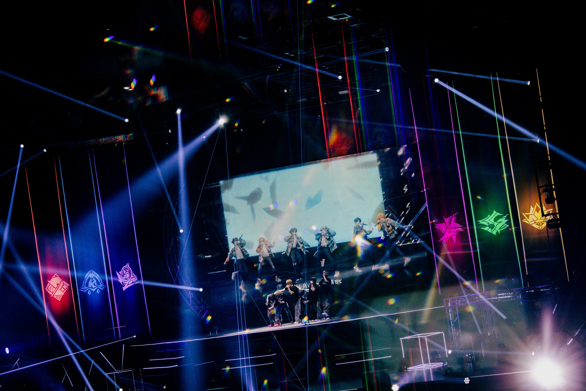 衣装のマントを取って披露されたのは、ファンの間で高い人気を得ているメンバー自己紹介ソング「SHALL WE GONG!?!? -1st battle-」。メンバーの個性的なラップがぶつかり合うアッパーチューンだ。さらに今年リリースされた「オシカツ?」では〈離さないよ?この先もずっと〉というフレーズを放った。