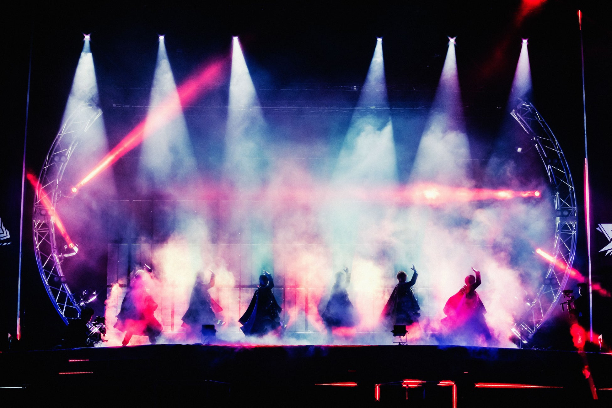 開演前の影アナはメンバー自身が担当。すぐにBGMの音量が上がり、会場は早くも心地よい熱気で包まれた。SFアクション的なオープニング映像に続き、2階建てステージの上階にLAN、暇72、いるま、雨乃こさめ、みこと、すちが登場。1stオリジナル曲「J0KER×JOK3R」でライブは幕を開けた。続いては2周年楽曲「Burn it All」。「騒ごうぜ、東京!」(いるま)というシャウト、ステージから炎が立ち上がる演出によってシクファミ(シクフォニのファンネーム)のテンションは早くも最初のピークに達した。