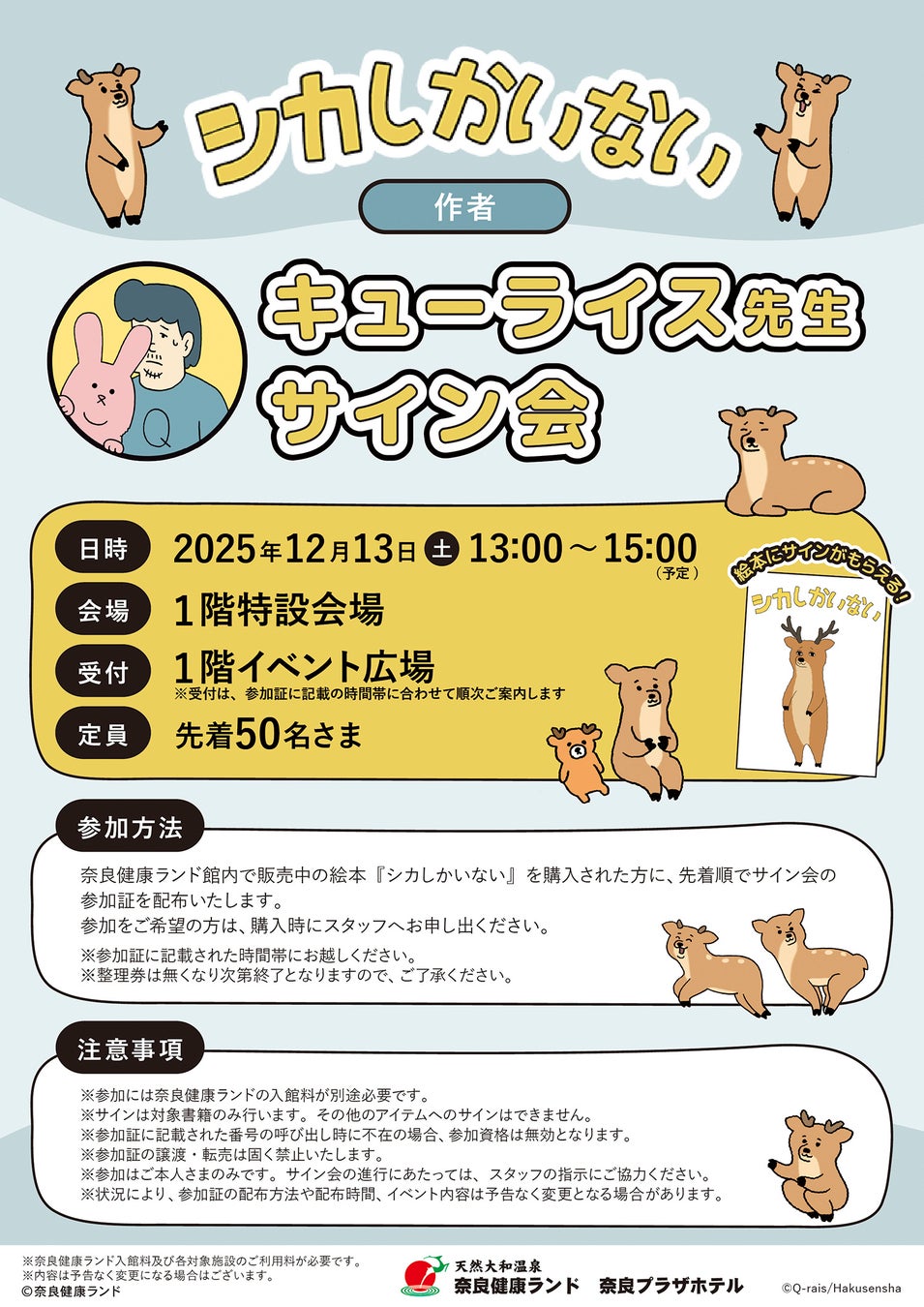 本イベントは、絵本作家であり漫画家のキューライス氏が描く、ちょっとシュールで不思議な魅力のシカ絵本『シカしかいない』と、癒しと楽しさが詰まった奈良健康ランドがコラボレーションした、冬の特別企画です。