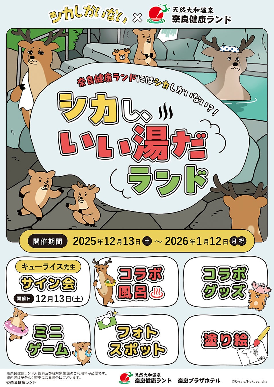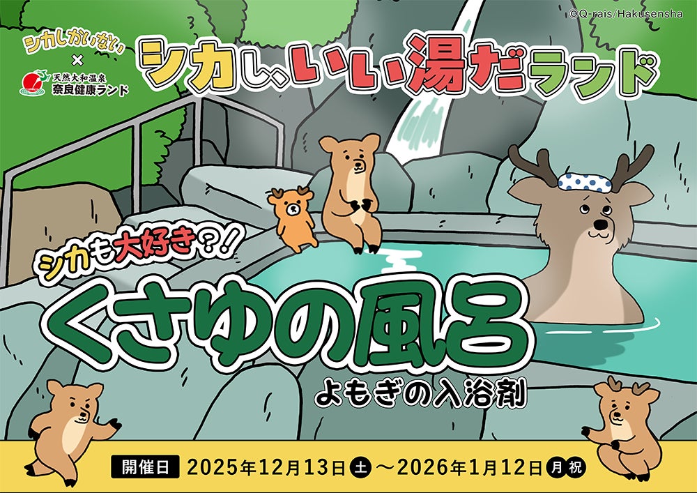 「たのしい」を世界中に届けるエンターテインメント・キャピタルの株式会社オリグレス(本社:東京都品川区、代表取締役社長:吉武優)は、絵本作家であり漫画家のキューライス氏による人気絵本『シカしかいない』(白泉社)と、奈良健康ランド 奈良プラザホテルのコラボイベント「シカし、いい湯だランド」を、2025年12月13日(土)から2026年1月12日(月・祝)までの期間、開催いたします。