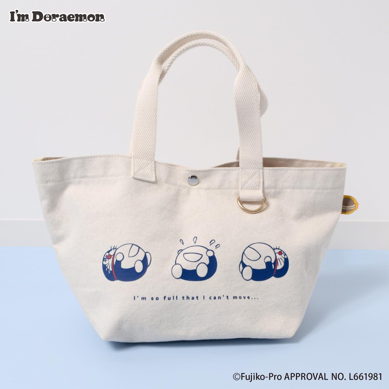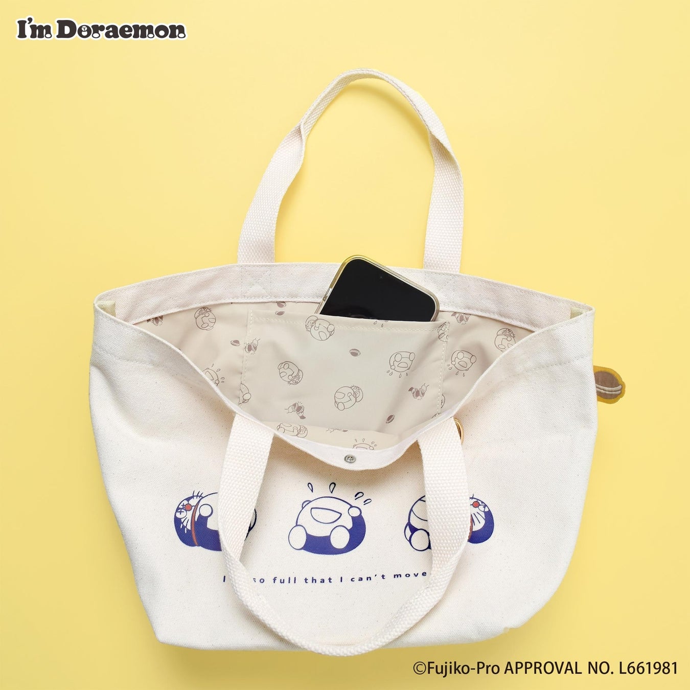 お腹いっぱいになっているドラえもんがかわいいトートバッグが登場。裏地はドラえもんの総柄デザイン、サイドにはどら焼きのネームタグ付きで、細部までこだわった仕様です。