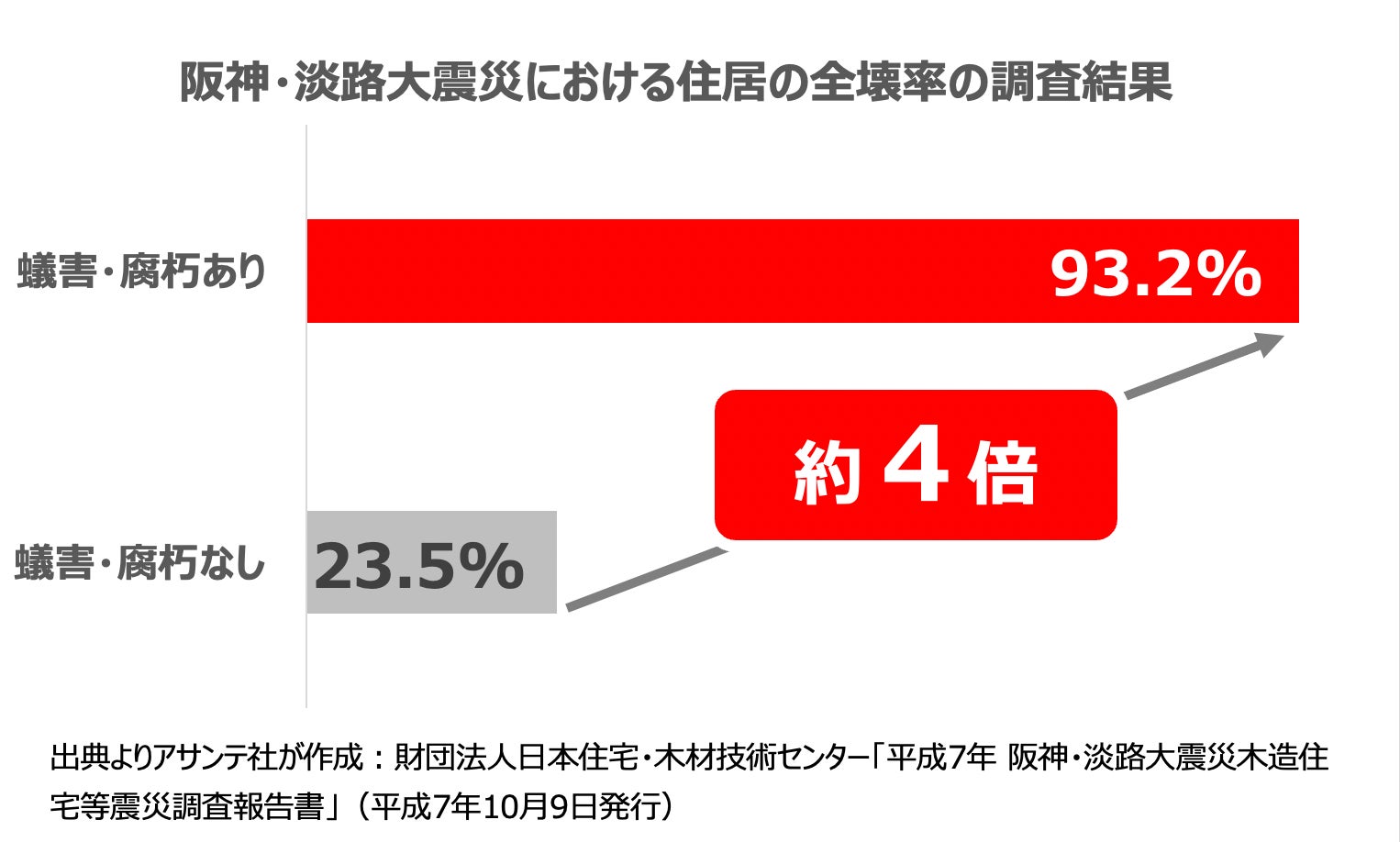 シロアリや腐朽によるダメージがある家屋は、倒壊リスクが高まります。阪神・淡路大震災での家屋の全壊率は、シロアリによる被害や腐朽があった建物では93.2%と高く、被害のない建物の約4倍にもなります。