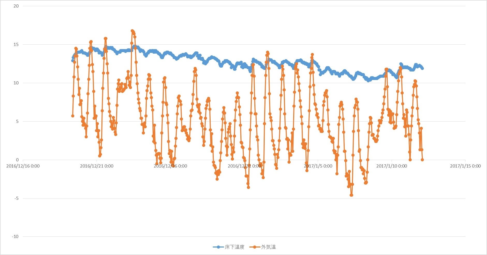 冬に虫の心配をする方は少ないでしょう。いろいろな虫と同様に、「シロアリも冬は休眠している」と思われがちですが、それは大きな間違いです。シロアリ防除のプロフェッショナルであるシロアリバスターズによると、一般的なイメージとは異なり、シロアリは1年中活動しており、冬の寒い時期であっても休眠しません。特に、日本に広く生息するヤマトシロアリは、温度によって活動量が大きく変わりますが、活動できる最低温度は6℃程度といわれています。グラフは、冬にアサンテ社員宅の床下の温度を測定したデータです。オレンジの線は外気温、青の線は床下温度を示しています。測定の結果、床下温度が外気温より高くなり、10℃を下回ることがありませんでした。もちろん、家の造りや地域などによっても異なりますが、このくらいの温度があれば、ヤマトシロアリは活動することができます。現代の高気密・高断熱住宅は、冬でも住宅の温度が保たれます。これは住宅に侵入したシロアリに対して冬の寒さから身を守り、年中活動し続けられる環境を提供しているのと同じ状態です。「新築だから大丈夫」「冬だからシロアリは活動していない」という考えは禁物です。快適な家に長く住み続けるためには、こうしたリスクの認識や定期的な点検、早期の対策が必要です。