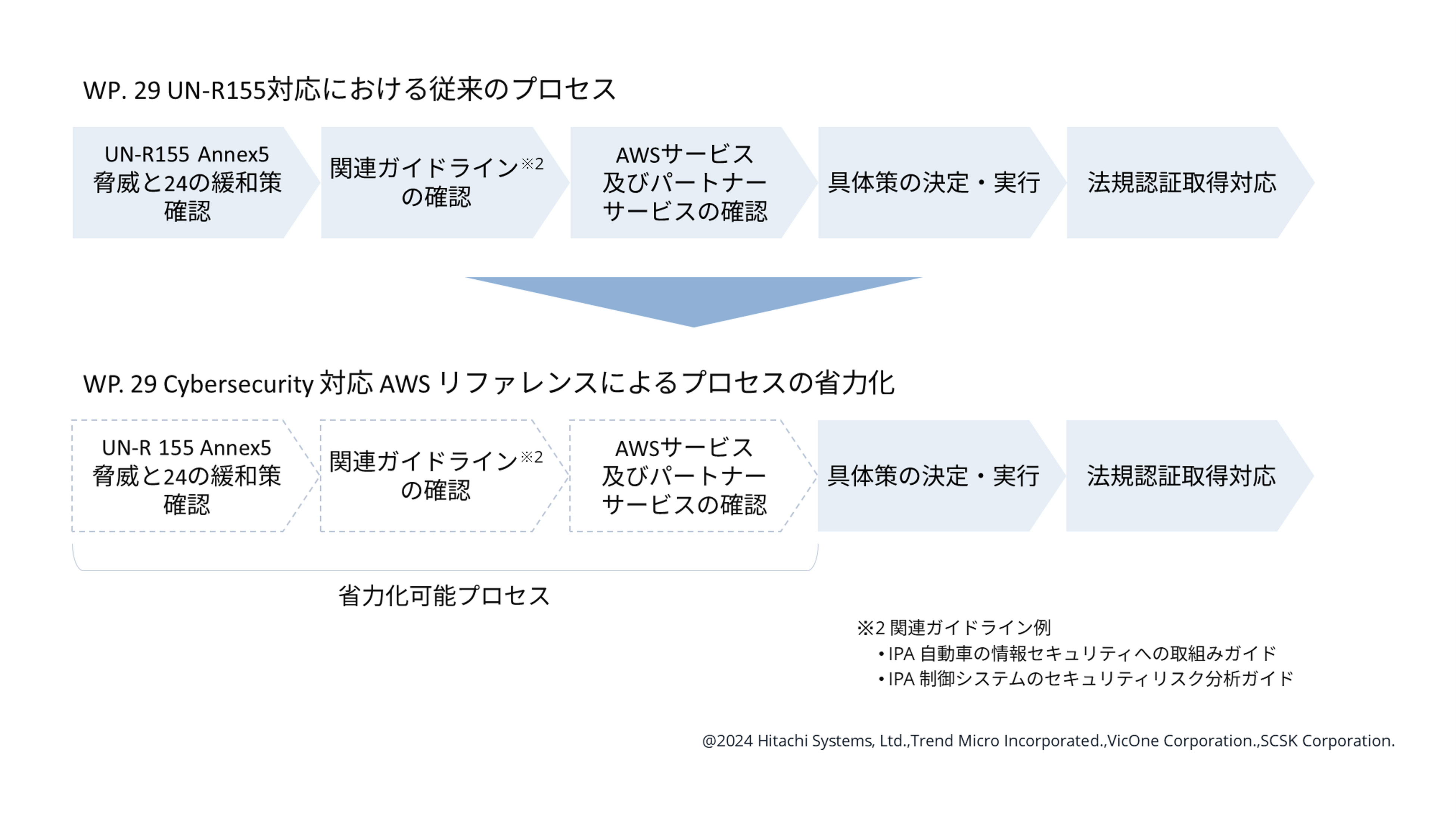 トレンドマイクロ株式会社(東京都新宿区、代表取締役社長 (CEO) エバ・チェン)の子会社で、自動車向けサイバーセキュリティ分野のリーディングカンパニーであるVicOne株式会社(ヴィックワン、東京都新宿区、最高経営責任者(CEO)マックス・チェン)は、アマゾン ウェブ サービス(以下「AWS」)のパートナー企業である、SCSK株式会社、株式会社日立システムズと協力し、2024年6月6日に公開した『WP. 29 Cybersecurity 対応 AWS リファレンス』(以下「本参考文書」)の第2版を作成しました。本参考文書は2026年1月14日より無償で公開します。(本参考文書作成にあたり、AWSは事務局として参加しています。)