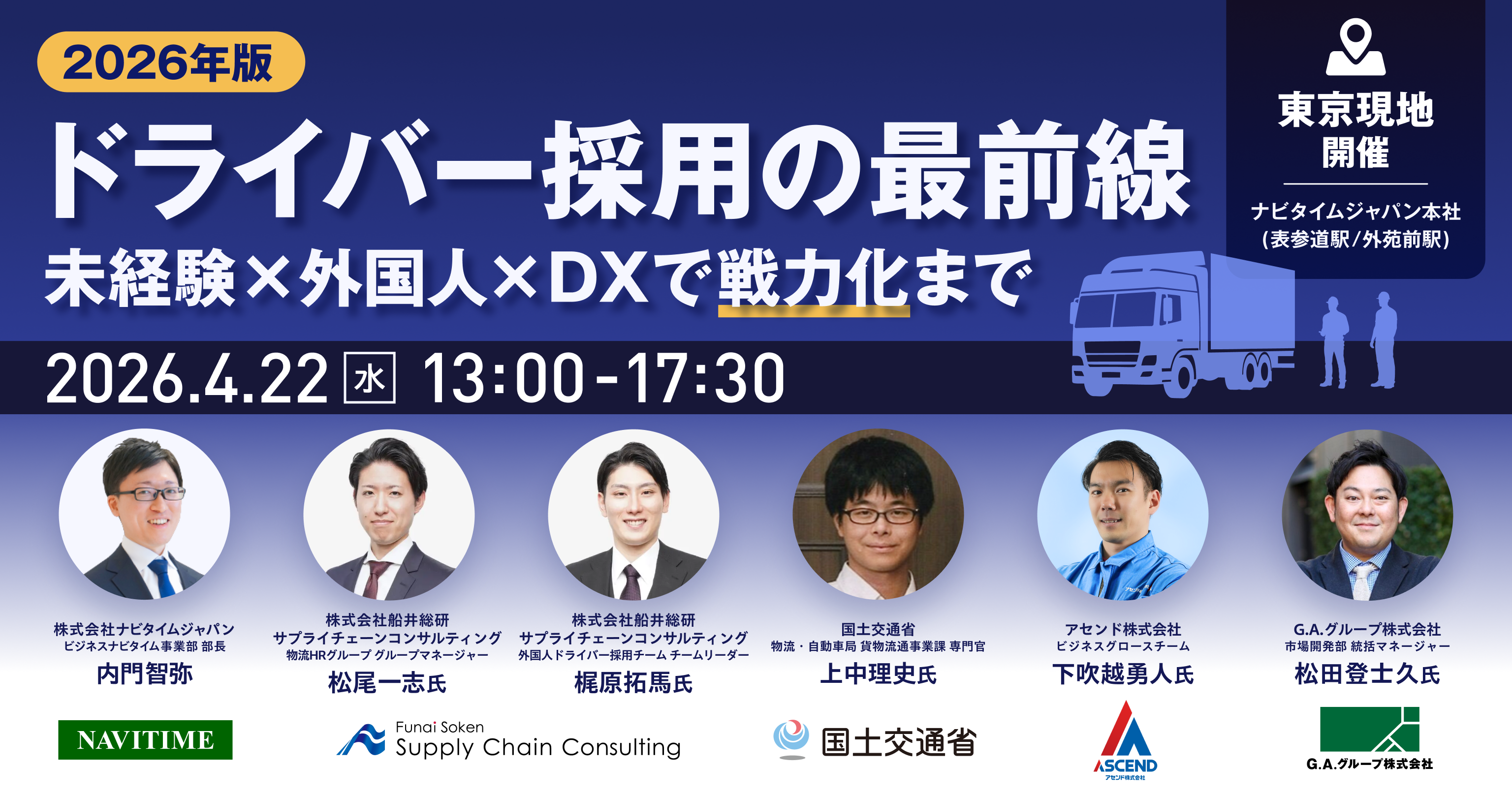 G.A.グループ株式会社(本社:東京都渋谷区、代表取締役:今泉 真徳)は、2026年4月22日(金)にナビタイムジャパン主催《【2026年版 ドライバー採用の最前線~未経験×外国人×DXで“戦力化”まで~》に登壇します。