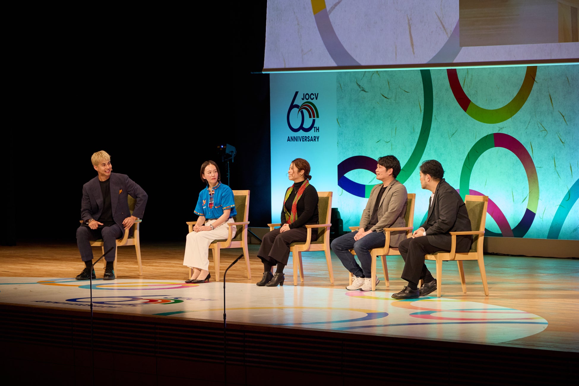 第二部では、60周年を記念しこれまでの軌跡を振り返る映像が上映された後、「世界と日本を変える力」をテーマにトークセッションが行われました。トークセッションでは、JICA海外協力隊の現場を訪問した経験があり、タレント・モデルとして活躍するユージさんをモデレーターとし、協力隊としての活動経験を生かし、帰国後も国内外のさまざまな分野で活躍する元隊員4名が登壇。インスタリム(株)代表取締役CEO德島泰さん、一般社団法人チョイふる代表理事の栗野泰成さん、(株)ORANDO PLUS代表の石山紗希さん、NPO法人自然塾寺子屋事務局長の森栄梨子さんは、いずれも協力隊としての活動前後で人生や価値観が大きく変わったこと、そして協力隊での活動を活かし、日本や世界の課題解決のために取り組んでいる事業について熱を込めて語りました。この中で、世界と日本を変えるためのプロセスは共通する部分が多くあり、それぞれの場所で暮らす人々に向き合い、テクノロジーも駆使しながら、持続的な課題解決へ取り組むことが重要であるといった考えが強調されました。