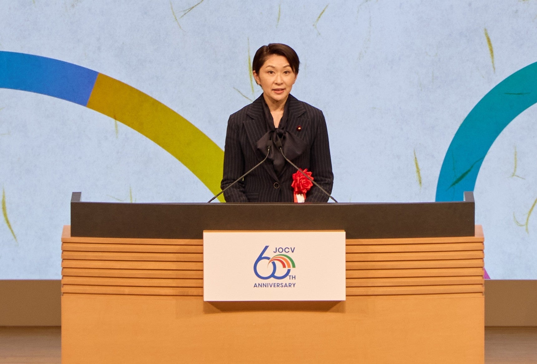 式典は二部構成で進行。第一部の冒頭では、JICA理事長 田中明彦が式辞を述べました。次に、天皇陛下からお祝いのお言葉を賜りましたほか、内閣総理大臣高市早苗氏のお言葉を外務大臣政務官英利アルフィヤ氏が代読され、日本の国際協力~特に青年海外協力隊の活動~を支援する国会議員の会会長・衆議院議員の小渕優子氏よりご祝辞を頂きました。