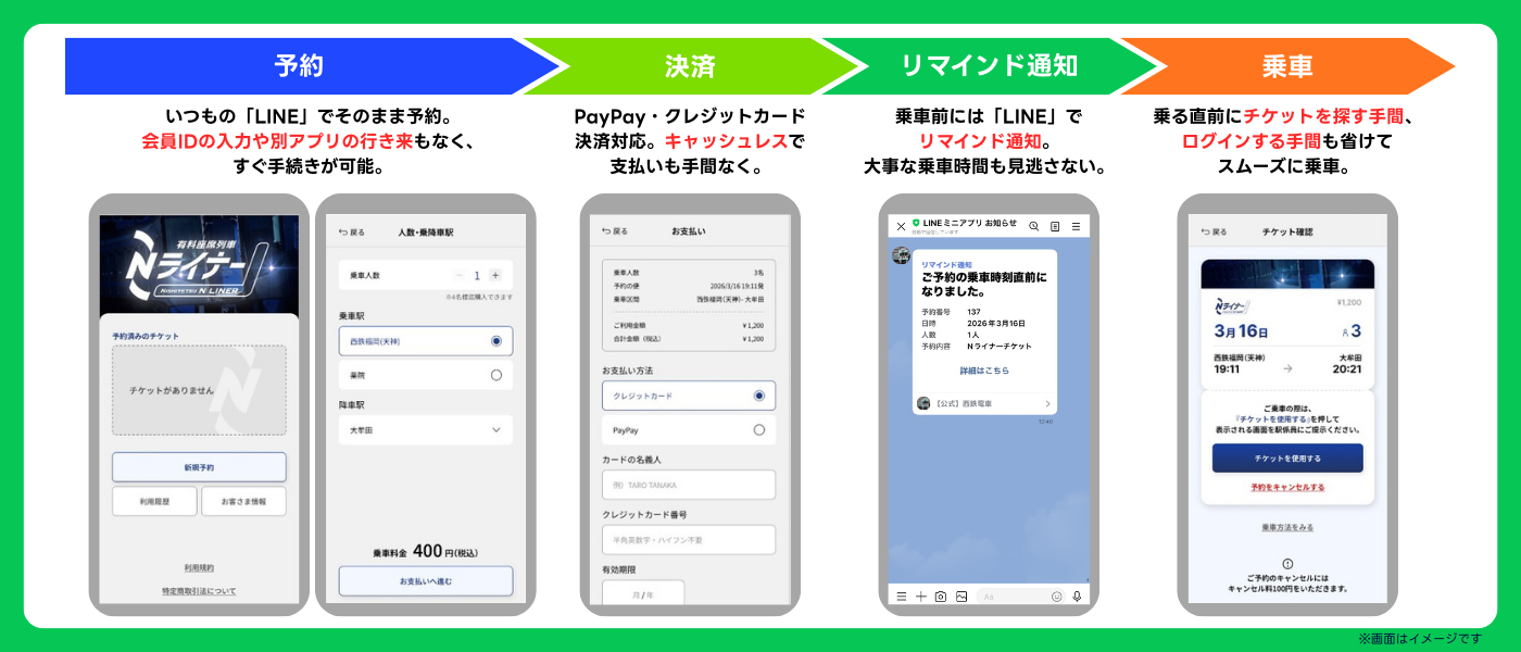 LINEヤフーコミュニケーションズ株式会社(本社:福岡市博多区、以下 当社)は、西日本鉄道株式会社(本社:福岡市中央区、以下 西日本鉄道)との「LINEを活用した西鉄グループのDX推進に関する連携協定」(2021年締結)に基づく取り組みの一環として、西日本鉄道が2026年3月16日より運行開始する有料座席列車「Nライナー」において、コミュニケーションアプリ「LINE」を活用した予約機能の企画・開発を支援しました。利用者は「LINE」上で、予約・事前支払い・乗車前の案内(リマインド)の受信・チケット提示までのすべてを行えるため、新しいアプリのダウンロードや、会員登録、ID・パスワードの入力といった手間が不要となり、迷わずスムーズに乗車できます。