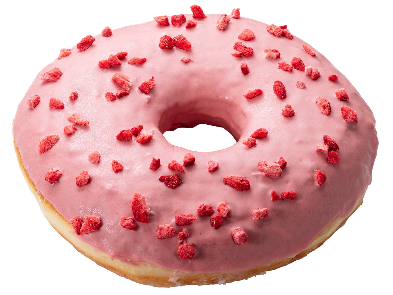 ふんわり食感のドーナツに、鮮やかなピンクのアイシングとカラフルなスプリンクルをトッピングしました。