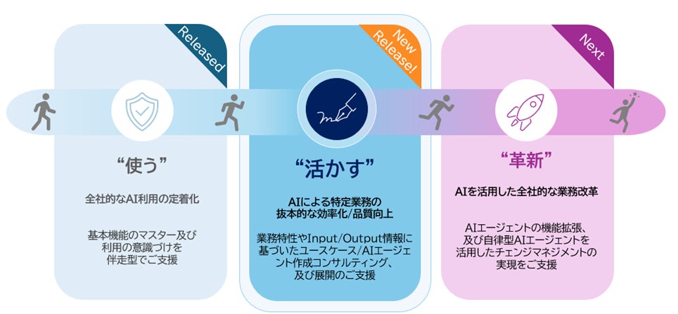 今後の展開として、第二弾以降は対象業務の拡大や複雑な業務プロセスへの適用、組織の仕事を自律的にAIエージェントが担う段階までコンサルティングサービスを拡張します。