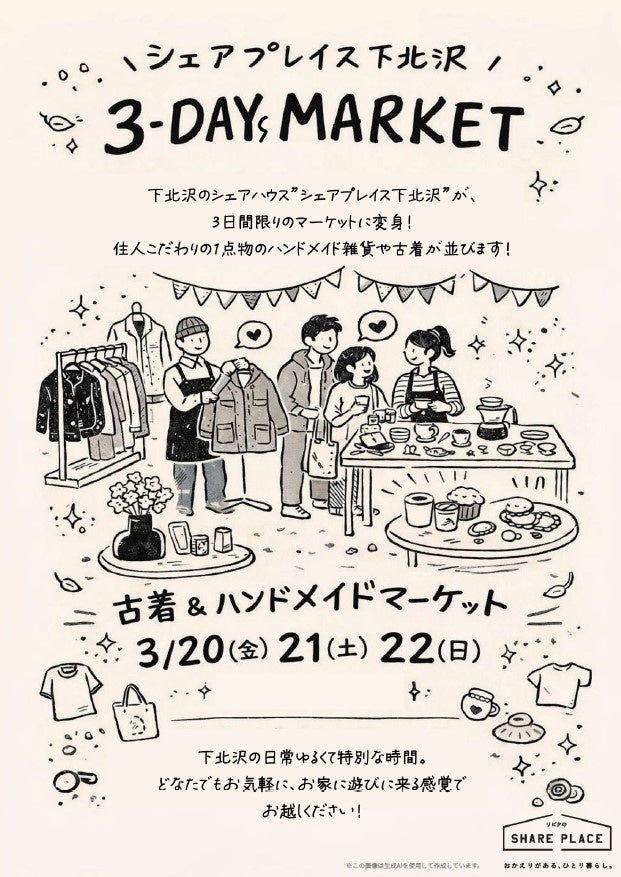 下北沢のシェア型賃貸住宅「シェアプレイス下北沢」が、3日限りのマーケットに変身!住人こだわりの一点物のハンドメイド雑貨や古着が並びます。お買い物の相棒には、丁寧に淹れた香り高いコーヒーを。下北の日常ゆるくて特別な時間。どなたでもお気軽に、お家へ遊びに来る感覚でお越しください!