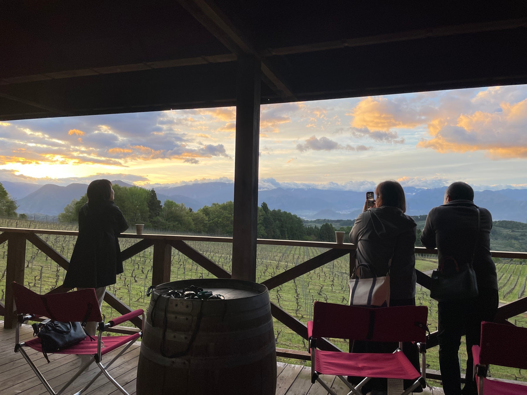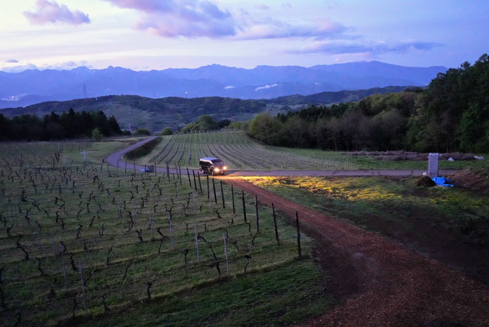 翌朝は、早朝4時に出発。日の出前の暗がりのなか、通常は入場することのできない大入ぶどう園へ向かいます。野鳥のさえずりだけが響く静かな朝の時間、山の合間から昇りゆく朝陽を眺めました。