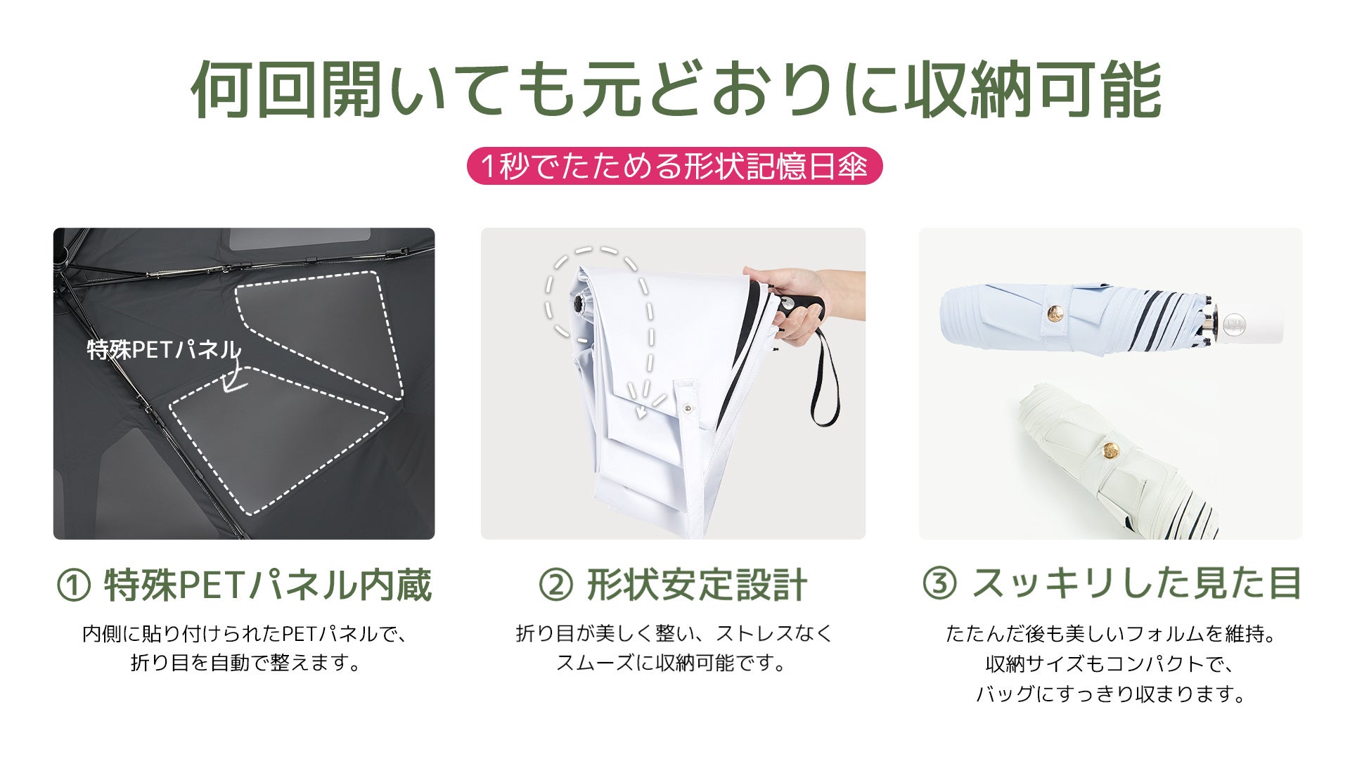 自動開閉ワンタッチ操作に加え、収納時にシャフトが途中で止まる安全設計を採用。手を離しても跳ね返らないため、力の弱い方でも安心してお使いいただけます。